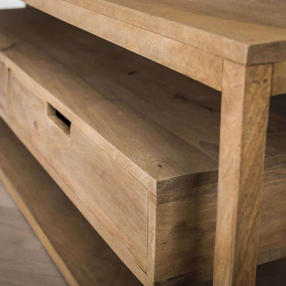 Deze haltafel ‘Sahara’ is uitgevoerd in mango hout met een zandkleur, net zoals de Sahara woestijn. De haltafel heeft twee lades, steunend op planken in het midden van het meubel waardoor de lades een zwevend effect krijgen. Deze haltafel maakt deel uit van de Sahara serie, bestaande uit twee nachtkastjes, een halftafel, een dressoir en een tv-meubel.