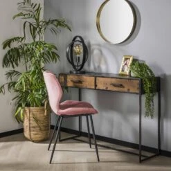 Deze trendy kaptafel ‘blend’ is uitgevoerd in metaal met een gun metal finish. De kaptafel beschikt over twee lades, deze zijn uitgevoerd in hout met een metalen greep. Deze kaptafel kan ook gebruikt worden als haltafel of bureau. Deze kaptafel behoort tot de ‘blend’ serie, een echte must-have voor ieder huis.