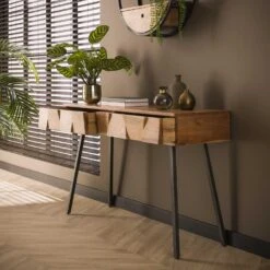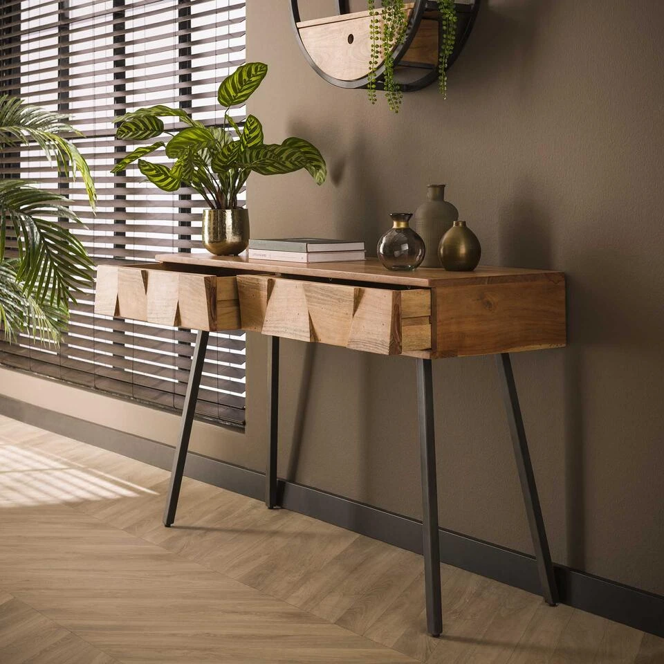 Deze trendy kaptafel ‘Demn’ is uitgevoerd in massief acacia hout met een prachtige bewerking op het front. Dit geeft de kaptafel een stoere, maar chique touch. Een echte eye-catcher! De kaptafel beschikt over 2 laden. De kaptafel heeft ook een bijpassend nachtkastje en TV-meubel.