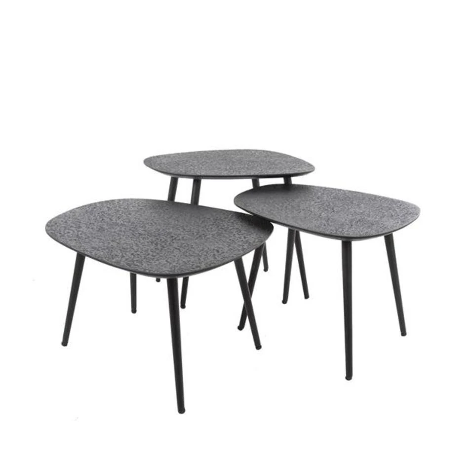 Deze trendy vierhoekige salontafel set van 3 is uitgevoerd in ‘metallic’ zwart. Op het blad zit een hele mooie bewerking welke een unieke uitstraling geeft. De tafels kunnen naar eigen inzicht speels bij elkaar neergezet worden. Deze set is een echte eye-catcher en maakt deel uit van de ‘metallic’ serie.