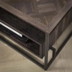 Deze trendy salontafel ‘Vine’ is uitgevoerd in teakhout. Het bovenste blad is ingelegd met een ‘versailles’ houtpatroon wat lijkt op visgraat en dit zorgt voor een prachtige uitstraling. De salontafel heeft een groot open vak en twee kleinere open vakken om spullen in op te bergen. Deze salontafel maakt deel uit van de ‘Vine’ serie. De tafel is 120 centimeter lang en 60 centimeter breed.Â