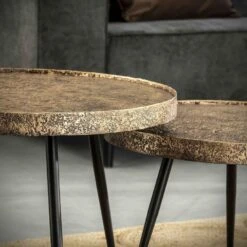 Deze trendy salontafel set is uitgevoerd in ‘metalic’ antiek brons. Op het blad zit een hele mooie bewerking welke een unieke uitstraling geeft. Deze ambachtelijke set is een echte eye-catcher en is super goed te combineren met veel verschillen stylen. De tafels hebben een diameter van 74 en 58 centimeter