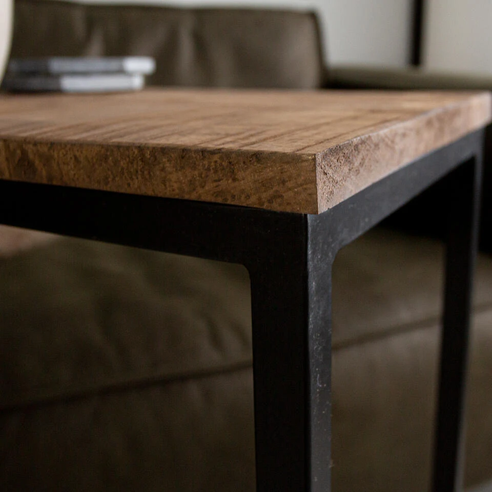 De zuil is voorzien van een massief mangohouten blad. Het mangohout heeft een lichte basiskleur en kenmerkt zich door ruige en donkere accenten. Enerzijds past het perfect in de huidige industriële interieurs, anderzijds heeft mango een behoorlijk koloniale uitstraling. Materiaal frame