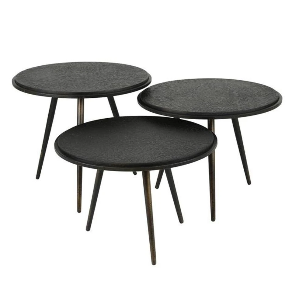 Het blad van de salontafel set Jazz is gemaakt van gepoedercoat metaal en is afgewerkt met een zwarte metallic finish. De tafeltjes beschikken over een vintage look.