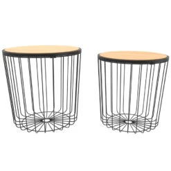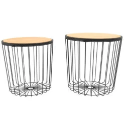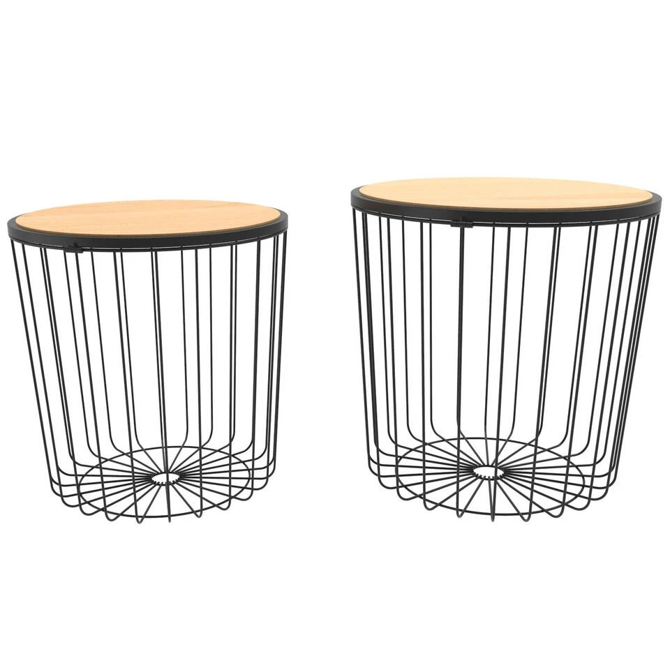 Set van 2x stuks bijzettafels rond. Handig als extra tafeltje naast de bank, maar ook leuk ter decoratie met een beeld of plant er op. Materiaal: metaal, hout. Afmeting grootste tafel: 42 x 42 x 42 cm. Afmeting kleinste tafel: 40 x 40 x 40 cm. Kleur: zwart, naturel.