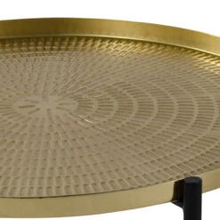 Ronde bijzettafel/plantenstandaard/oppottafel bestaande uit een gouden blad op een zwart onderstel. Leuk ter decoratie met een beeld of plant er op.