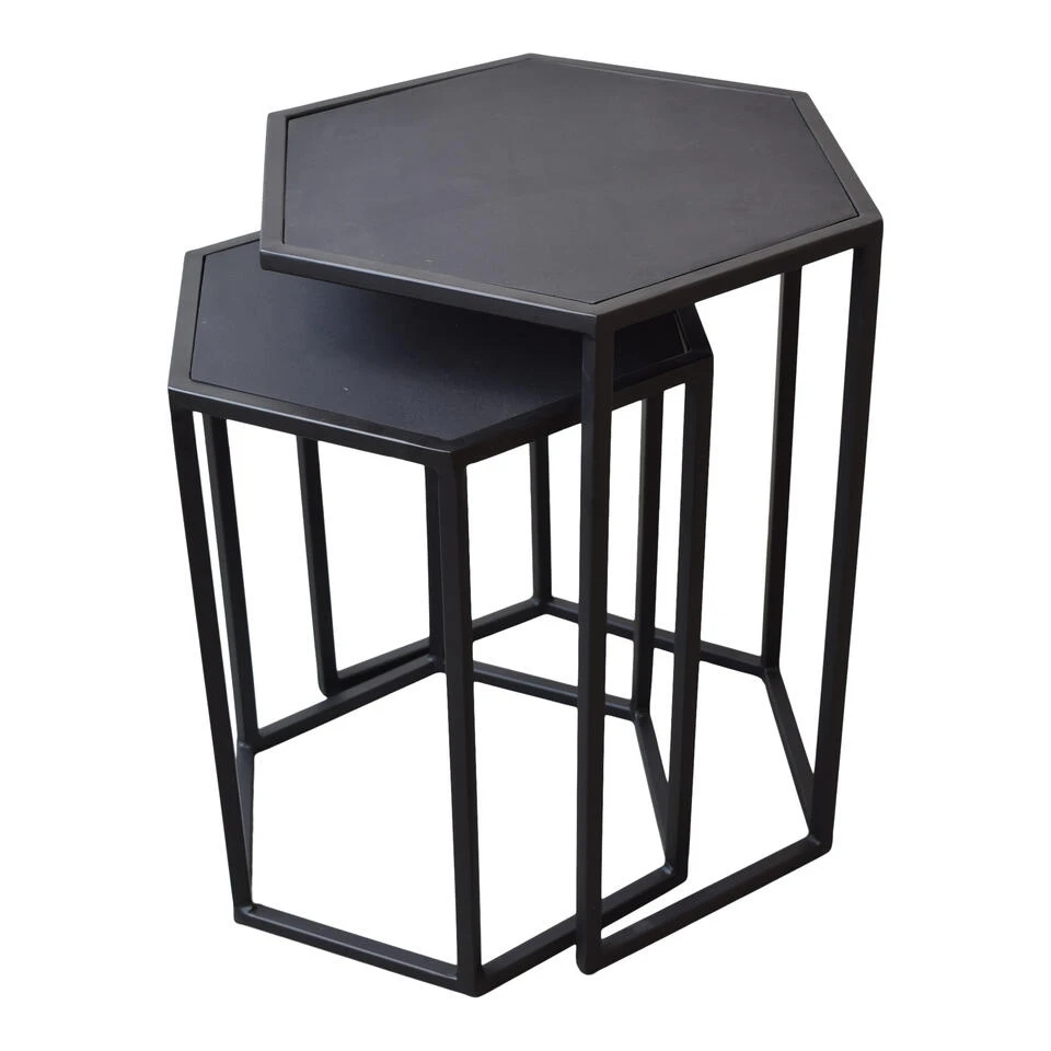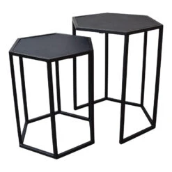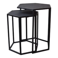 Multifunctioneel, deze set van 2 salontafels! Je kunt de tafels namelijk samen gebruiken als salontafels, maar ook apart als bijzettafel.  Deze set Loft42 zeshoek salontafels bestaat uit twee salontafels gemaakt van zwart staal in combinatie met een blad van zwart mangohout. De tafels zijn perfect in elkaar te schuiven.