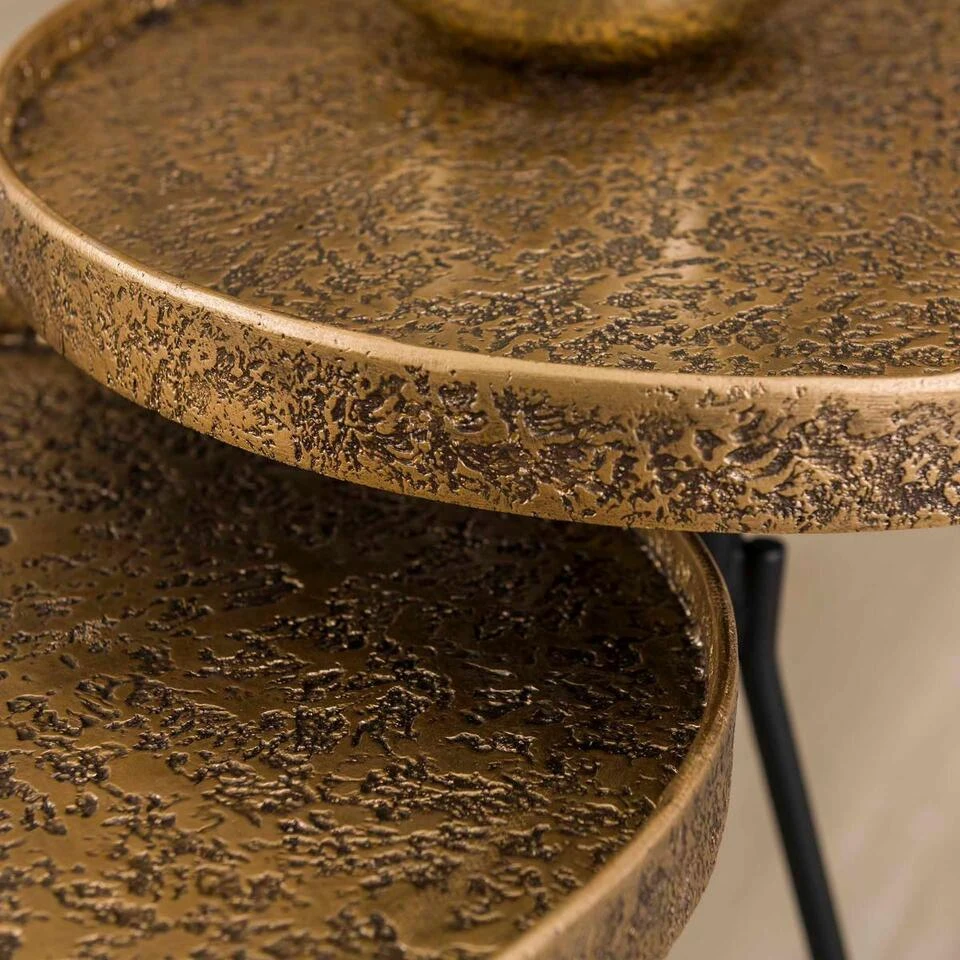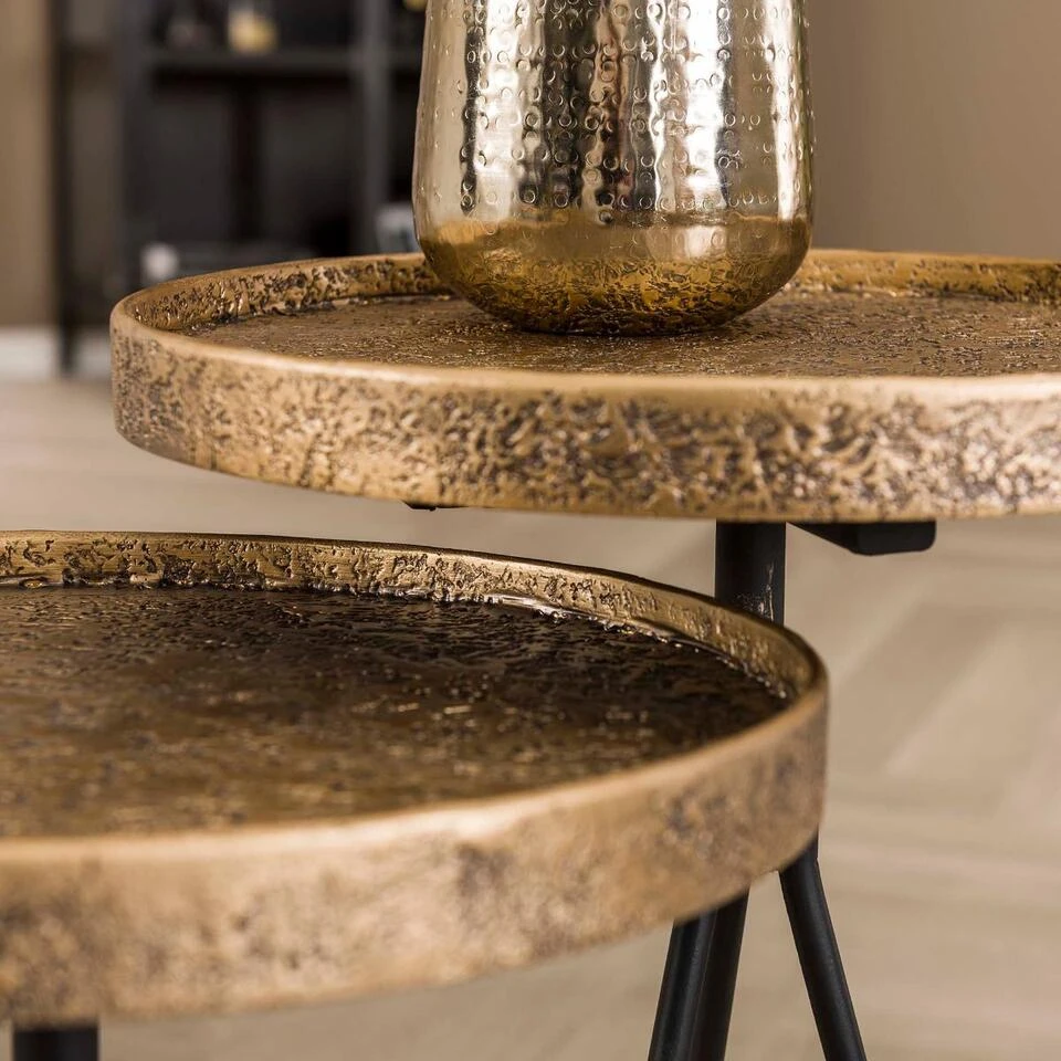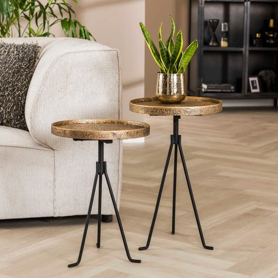Bijzettafelset Maaike komt uit de collectie van het woonmerk Fraaai en straalt een stoere, moderne en stijlvolle sfeer uit. Deze gave set bestaat uit twee tafeltjes met verschillende afmetingen, welke beide voorzien zijn van een rond tafelblad. Beide tafelbladen zijn gemaakt van metaal met een antieke bronskleurige tint als afwerking. Opvallend aan deze afwerking is de ruwe en oneffen structuur voor een unieke look. Het onderstel van elk tafeltje bestaat uit drie sierlijke poten en is uitgevoerd in stevig zwart metaal. Dankzij de verschillende afmetingen, kunnen deze tafeltjes op een speelse manier bij elkaar geplaatst worden voor een unieke touch in uw interieur. Plaats bijzettafelset Maaike in de woonkamer en geniet van zijn mooie design. Combineer hem ook met de bijpassende salontafelset voor eenheid in het interieur. De tafels hebben een afmeting van 50×38 cm en 60×38 cm.
