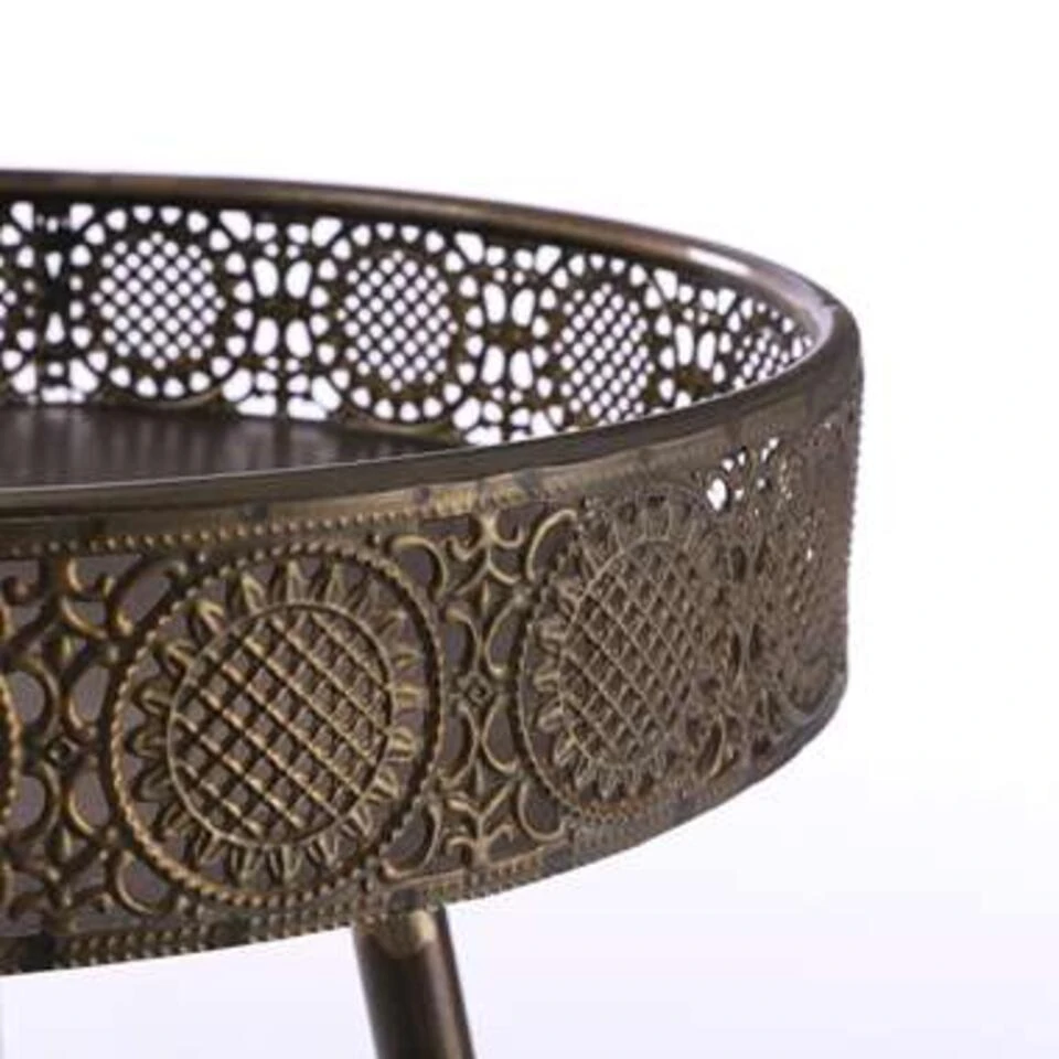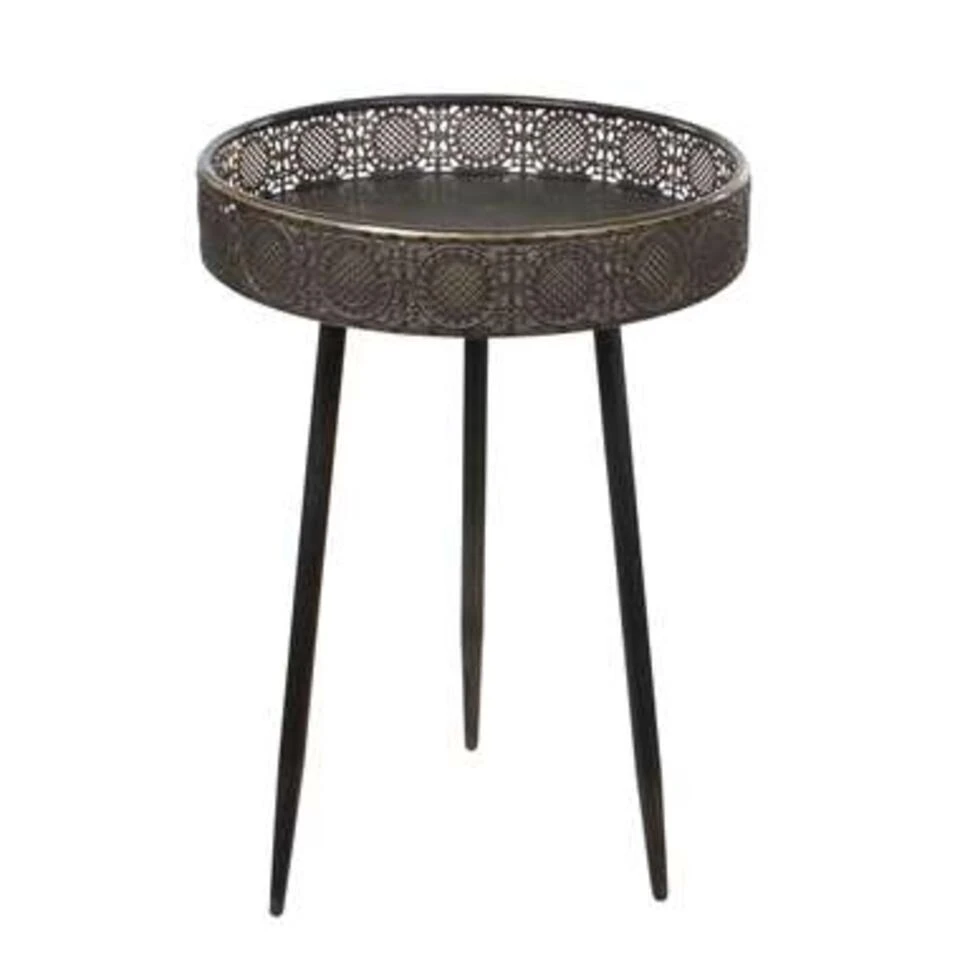 Bijzettafel van H58 x Ø40 cm.Gemaakt van stevig metaalDe tafel heeft een mooie, bronskleurVoorzien van een leuk patroon in de 7 cm hoge randLaat je verleiden door deze prachtige bohemien Lagune bijzettafel van Mica Decorations. Het tafeltje is gemaakt van stevig metaal en bronskleurig. In de hoog opstaande rand is een romantisch patroon verwerkt, wat de tafel een unieke uitstraling geeft. Tegelijkertijd is het een extra beveiliging voor alles wat je erop zet. Bijvoorbeeld een drankje of een goed boek. De afmetingen zijn H58 x Ø40 cm.