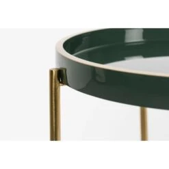Bijzettafel Bryne is stijlvol, modern en helemaal van nu! Deze bijzettafel valt namelijk op door zijn prachtige ronde tafelblad in combinatie met het goudkleurige onderstel. Het blad is vervaardigd uit aluminium en heeft als afwerking een glanzende laag gekregen. Voor het onderstel is gekozen voor gepoedercoat ijzer, welke in het midden bij elkaar komt. Gebruik dit bijzettafeltje om een kop koffie of thee op neer te zetten, maar ook om te decoreren met kleine spulletjes. Bijzettafel Bryne is verkrijgbaar in het donkerblauw en -groen.