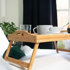 Dit QUVIO bedtafeltje dienblad is erg eenvoudig in gebruik. Het product wordt gemonteerd geleverd,dus je hoeft zelf niets meer te boren of te schroeven. Het tafeltje klap je eenvoudig uit. Je hoeft dan alleen nog maar te gaan zitten en het houten tafeltje over je benen te schuiven of voor je neer te zetten. Dankzij het dienblad van QUVIO heb je een stabiele basis voor een lekker ontbijtje op bed en loop je een stuk minder risico op het omvallen van dranken zoals jus d’orange of hete koppen koffie of thee. Bovendien kun je met dit product ook een stevige ondergrond creëren voor je laptop. Zo heb je zelfs de mogelijkheid om ’s avonds op de bank of in bed nog aan het werk te gaan. Wanneer het bedtafeltje niet meer gebruikt wordt,kun je het product eenvoudig inklappen. Hierdoor kun je de tafel ook gemakkelijk vervoeren en neemt het maar weinig ruimte in beslag. Het bedtafeltje heeft een neutrale houtkleur en is gemaakt van milieuvriendelijk bamboe. Materiaalsoorten die lang mooi en goed blijven en samen voor een stevige combinatie zorgen.