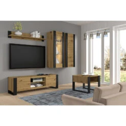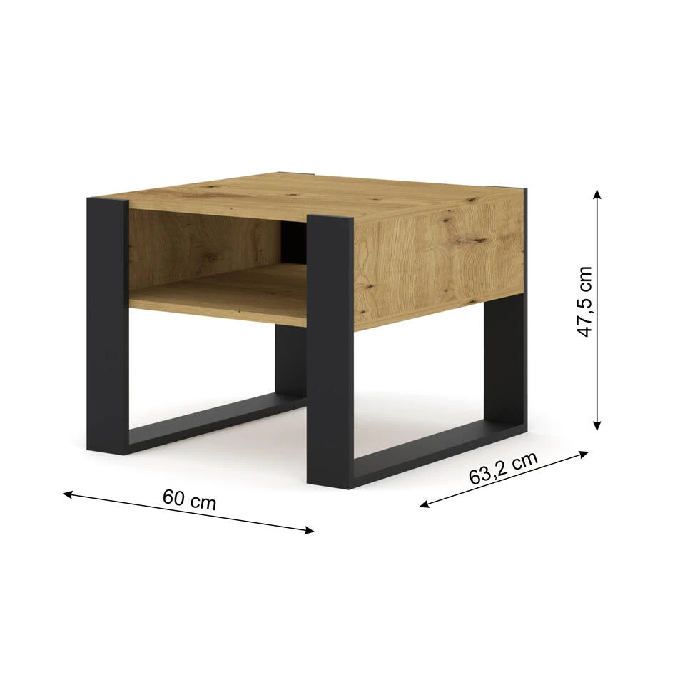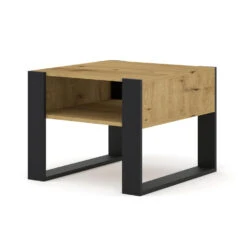 Zeer moderne en praktische salontafel voor in de woonkamer in de vorm van een compact vierkant. Hij kenmerkt zich door een moderne en oogstrelende uitstraling – zijn charme wordt bepaald door grote zwarte poten in framevorm, die mooi contrasteren met de rest van het meubilair.De tafel heeft een extra plank.
