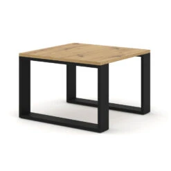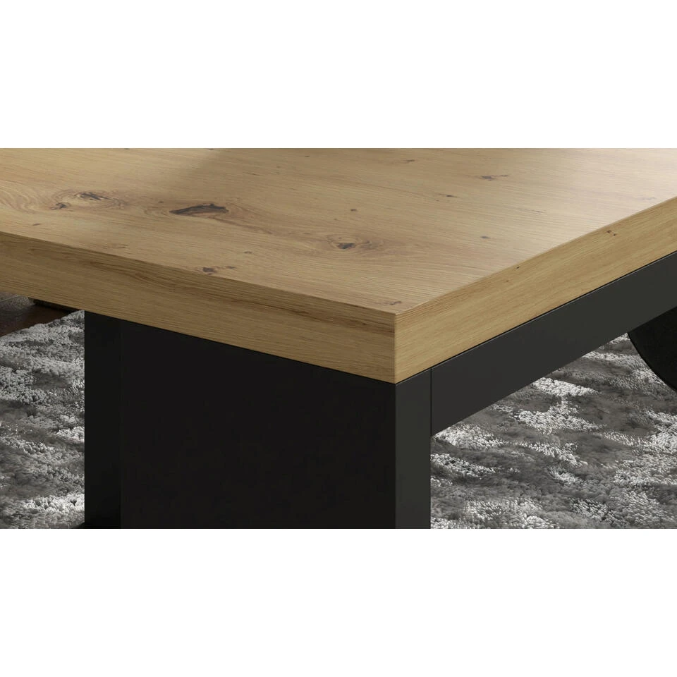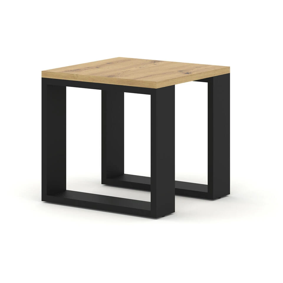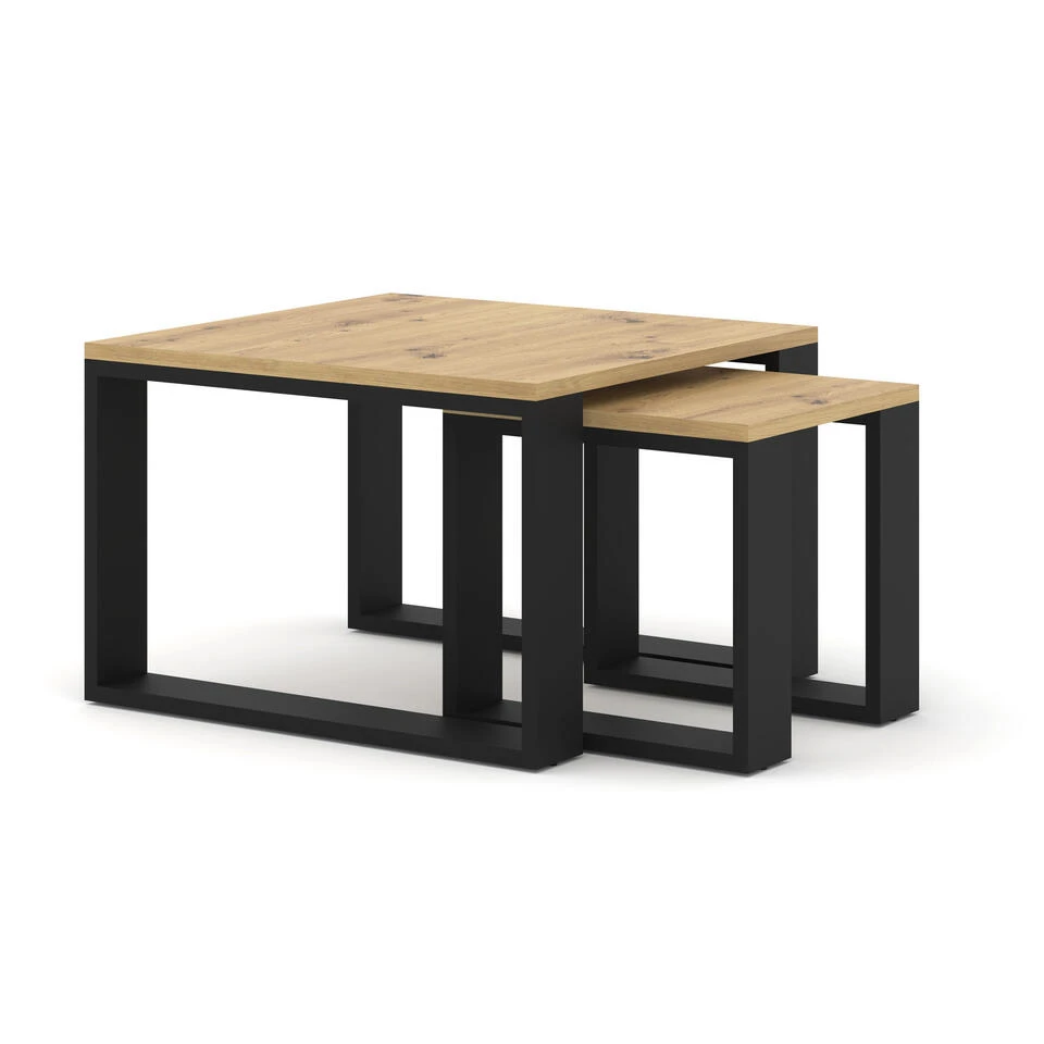 Extreem stijlvolle, dubbele salontafel voor de woonkamer uitgevoerd in modieuze en natuurlijke kleuren. Hij kenmerkt zich door een moderne en oogstrelende uitstraling – zijn charme wordt bepaald door zwarte poten in framevorm, die mooi contrasteren met de rest van het meubilair.