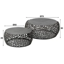De salontafels zijn voorzien van een zand gegoten dun bovenblad die zwart nikkel zijn afgewerkt. Het metaal zorgt voor stevigheid en is makkelijk te onderhouden. De tafeltjes hebben verschillende diameters: De grote salontafel is 75 cm en de kleine is 55 cm.Â