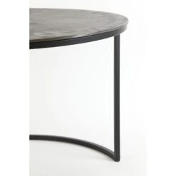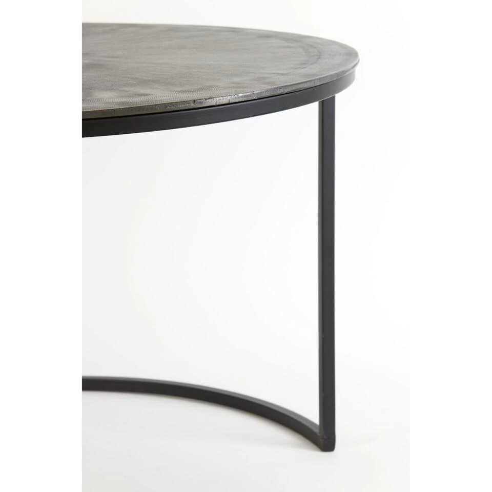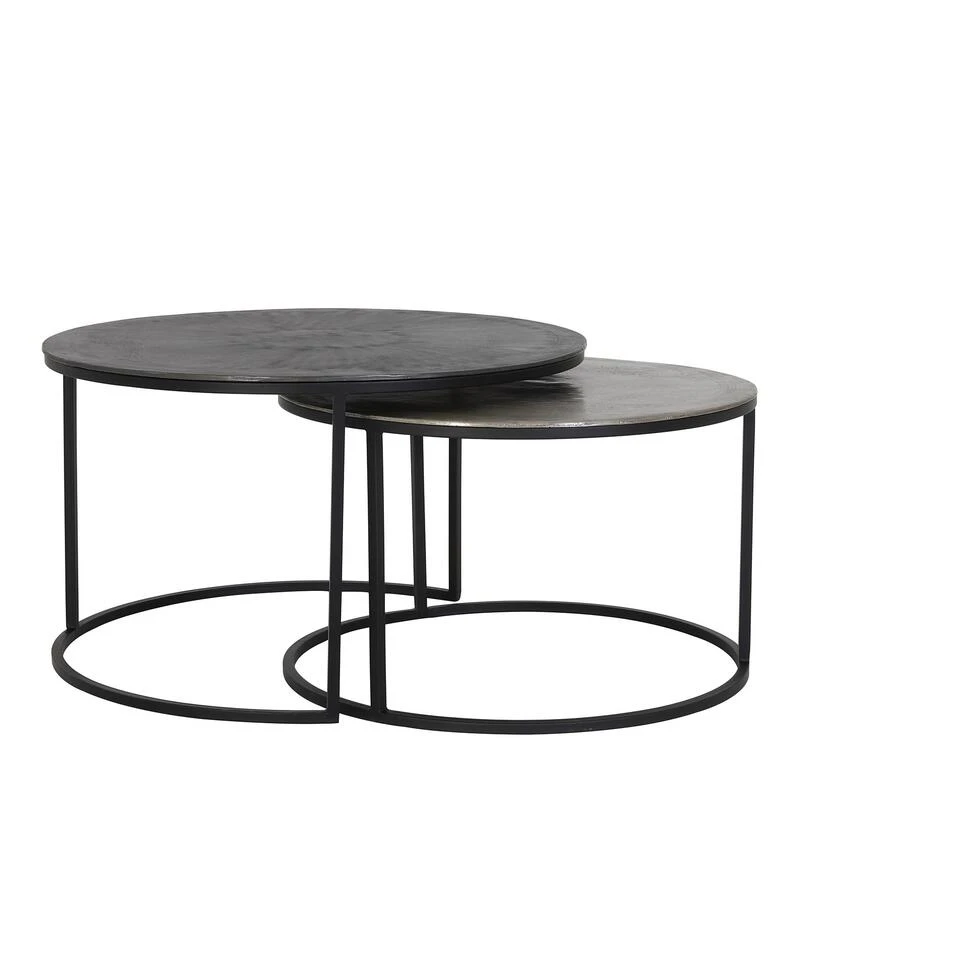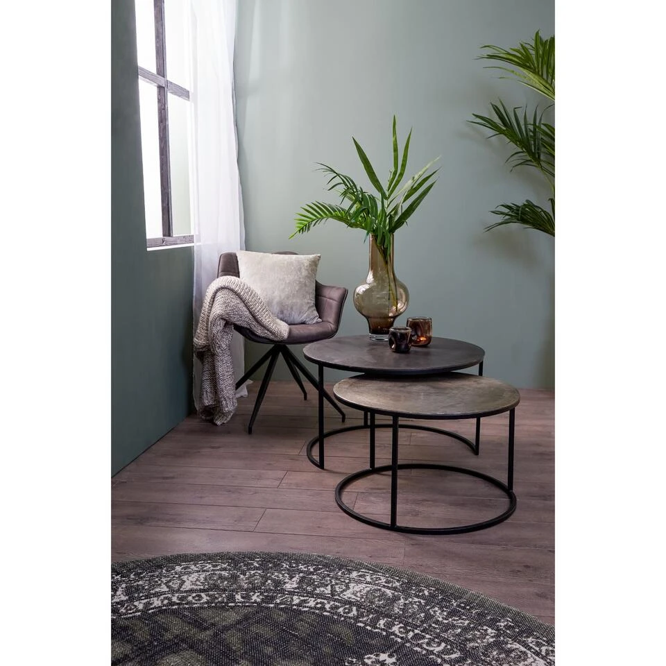 Salontafel Talca van het merk Light & Living bestaat uit een set van 2 tafeltjes. Het tafelblad van de grote tafel heeft een antieke lood kleur en de kleine tafel een ruw lood kleur, beide bladen bevatten veel robuuste details. Dit zorgt voor een industriële uitstraling. Het frame heeft een matzwarte kleur en de bladen hebben een bijzondere rand met gedetailleerde afwerking. Dit zorgt voor een combinatie die in veel ruimtes passend is. Bij gebrek aan ruimte zijn deze salontafels ook gemakkelijk in en onder elkaar te schuiven. Door de ronde vorm zijn de tafels passend in iedere ruimte. Ideaal om voor de bank te plaatsen en een heerlijke kop thee op te zetten. Wij adviseren wel altijd gebruik te maken van onderzetters. De grote tafel heeft een diameter van 75 cm en een hoogte van 45 cm. De kleine tafel heeft een diameter van 67,5cm en een hoogte van 39,5 cm. De tafels zijn handgemaakt en kunnen daardoor kleine oneffenheden bevatten. Dat maakt deze tafels juist zo uniek!