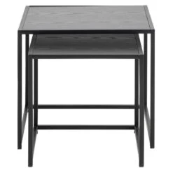 Set bijzettafels Jaxx bestaat uit twee stoere tafeltjes in de kleur zwart. De tafels hebben beide een zwart, metalen onderstel en diepzwart houten blad. Dat geeft de tafels de perfecte uitstraling die je wilt creëren in jouw interieur. De set bestaat uit een kleiner tafeltje (40x40x40 cm) en een wat grotere tafel (50x50x40). De kleinere variant past perfect onder de grotere variant. Zo kun je zoveel plek creëren als je zelf wilt.Â