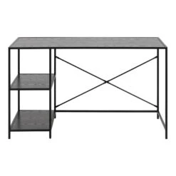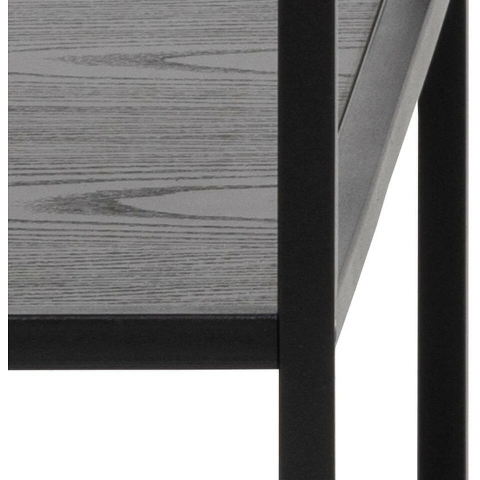 - Materiaal: Blad en plank van ruw zwart essen melamine, onderstel van mat zwart ruw gepoedercoat metaal