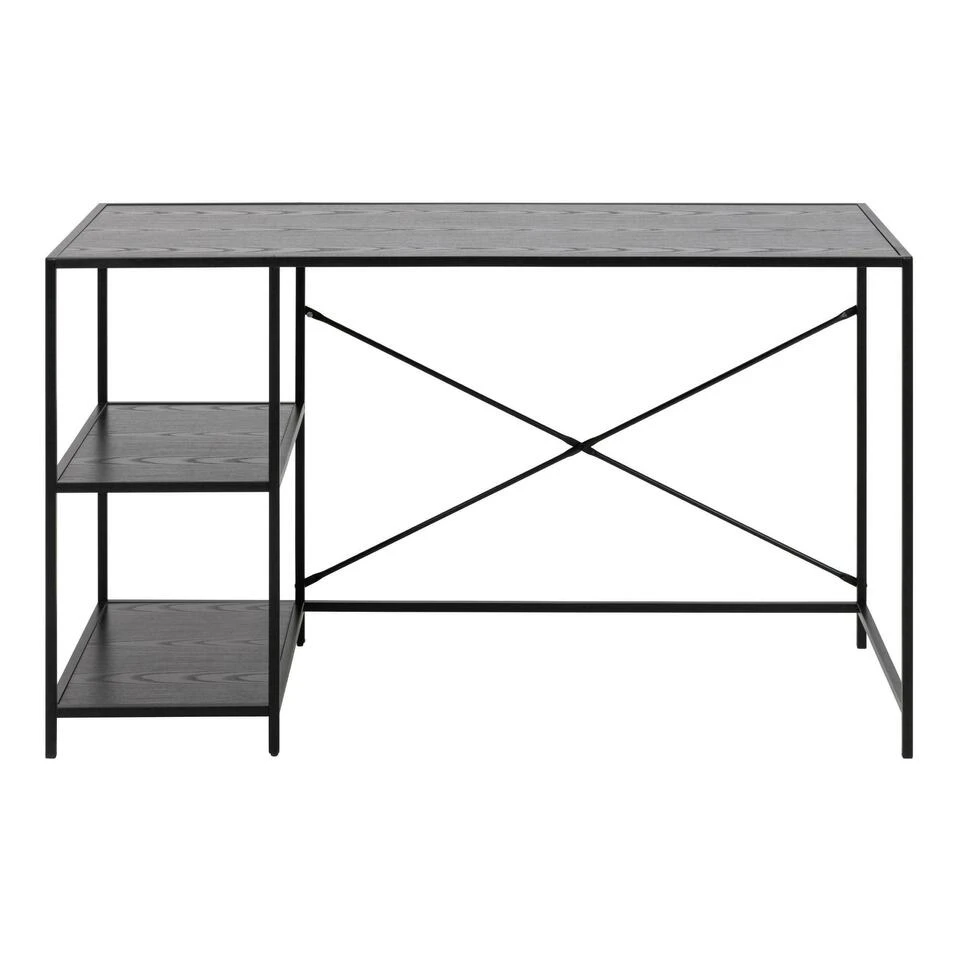 Verhoog je productiviteit aan dit stijlvolle bureau met veel opbergruimte. De combinatie van de zwarte essenhouten look en het zwarte metaal zorgen voor een consistent designstuk. Dit bureau maakt een kamer stijlvol af en is gemaakt om te passen bij vele stijlen van inrichting. Het heeft 2 ruime planken – perfect voor het opbergen van je kantoorbenodigdheden.