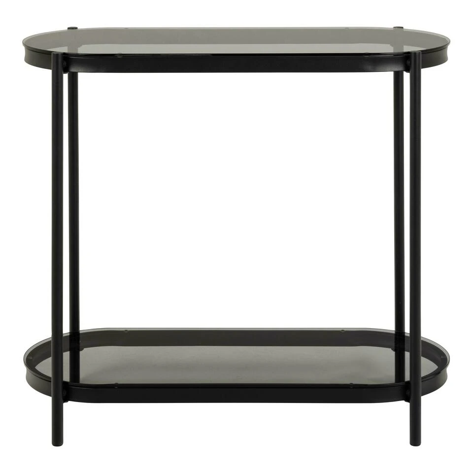 Creëer goede vibes in je woonruimte met deze pilvormige consoletafel. Hij combineert gerookt glas met gepoedercoat metaal tot een consoletafel die past in het moderne huis. Hij heeft ook een plank van gerookt glas onder het tafelblad, die extra ruimte biedt.