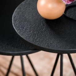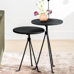 Serie Ties is afkomstig van het woonmerk Vurna en bestaat uit diverse prachtige meubels. Deze serie valt op door het gebruik van zwart staal. Helemaal van nu! Zwart staal zorgt voor een stoere uitstraling en past in diverse woonstijlen. Het heeft een strakke en luxe uitstraling. Deze bijzettafelset bestaat uit twee ronde tafeltjes van zwart staal. Deze bijzettafelset valt op door zijn sierlijke pootjes. Gebruik de tafels naast elkaar als salontafelset of gebruik de tafels afzonderlijk van elkaar als twee gave bijzettafels. De afmetingen van de tafels zijn: B38xD38xH60 en B38xD38xH49 cm. Het gebruik van onderzetters wordt altijd geadviseerd om de levensduur van het product te verlengen.