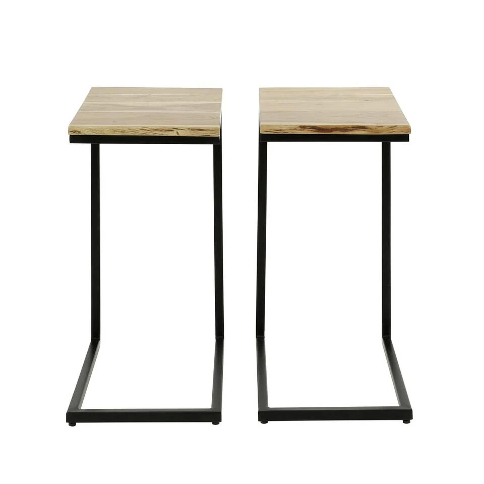 Bijzettafel/bed tafel Tom (set van 2) heeft een stoer en natuurlijk uiterlijk. De combinatie met het massieve blad van acaciahout en het metalen frame zorgt dat Tom ideaal past binnen een industriële sfeer. Het metalen frame is afgewerkt in zwart poedercoat. Voor een extra robuuste afwerking is het frame niet helemaal egaal gespoten maar voorzien van diverse schuurplekken. Het blad is van acaciahout en handgemaakt. Dit zorgt ervoor dat ieder blad uniek is. Tom is multi inzetbaar als bijzettafel, nachtkastje of laptoptafel. Kijk ook eens naar de andere onderdelen van de Tom-serie van het woonmerk Fraaai voor eenheid in het interieur. Deze tafel heeft een hoogte van 61 cm en is gemakkelijk bij de bank te schuiven. Daarnaast is deze set te gebruiken als bed tafel. Het blad heeft een afmeting van 30×45 cm.