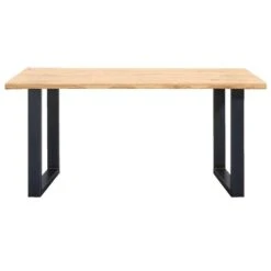 De eettafel heeft een massief eiken tafelblad met boomstamafwerking. Het blad rust op een stevig metalen frame, in de vorm van een U. Hout met metaal is al enige tijd een stoere en populaire combinatie! Het tafelblad heeft een afmeting van 200×100 cm. De tafel heeft een hoogte van 75 cm. Let dus op met het kopen van een bijpassende eetkamerstoelen met leuningen.