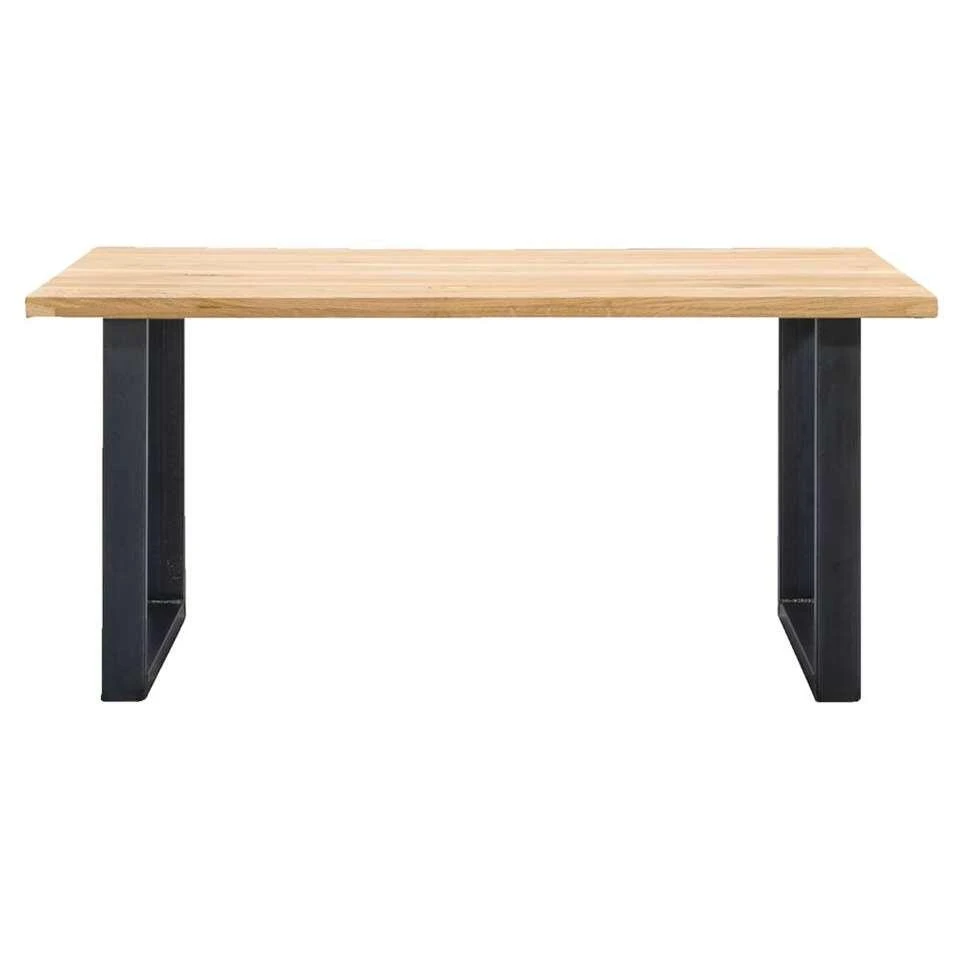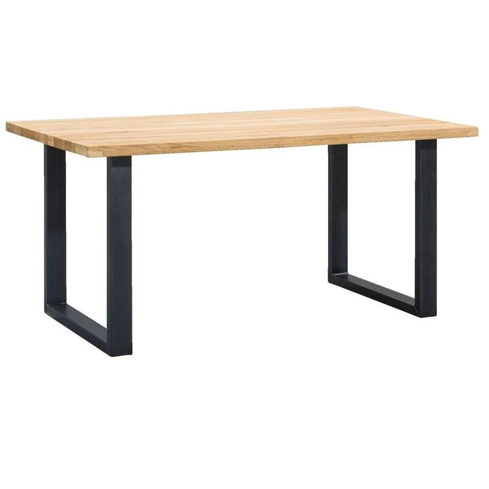 De eettafel heeft een massief eiken tafelblad. Daaronder zit een stevig metalen onderstel, in de vorm van een U. Hout met metaal is al enige tijd een stoere en populaire combinatie! Het tafelblad heeft een afmeting van 160×90 cm. De tafel heeft een hoogte van 75 cm. Let dus op met het kopen van bijpassende eetkamerstoelen met leuningen.