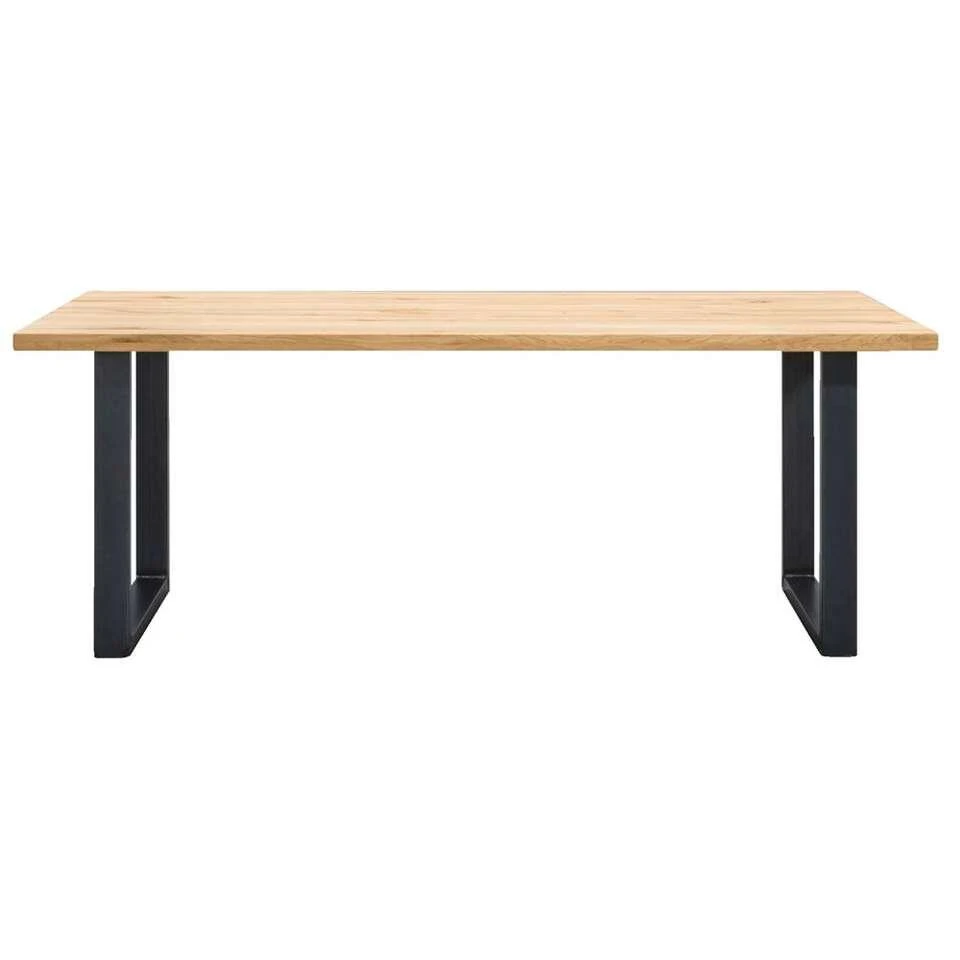 De eettafel heeft een massief eiken tafelblad. Daaronder zit een stevig metalen onderstel, in de vorm van een U. Hout met metaal is al enige tijd een stoere en populaire combinatie! Het tafelblad heeft een afmeting van 200×100 cm. De tafel heeft een hoogte van 75 cm. Let dus op met het kopen van een bijpassende eetkamerstoelen met leuningen.