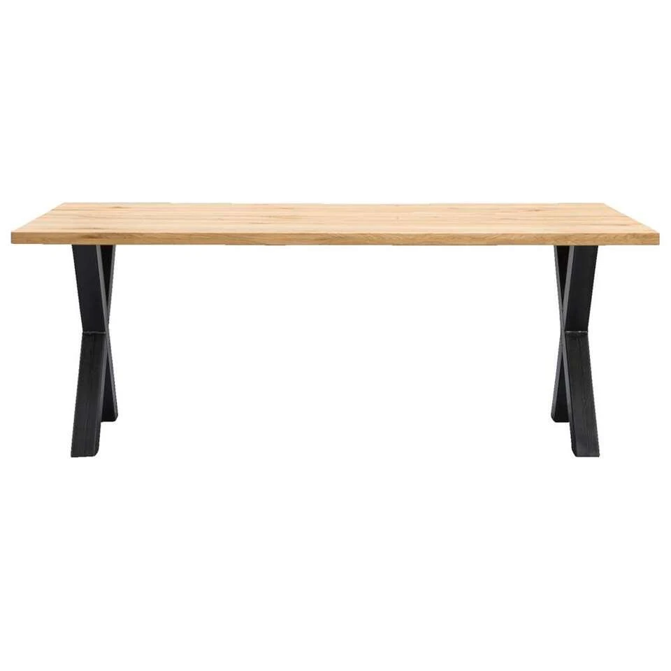 De eettafel heeft een massief eiken tafelblad. Daaronder zit een stevig metalen onderstel, in de vorm van een X. Hout met metaal is al enige tijd een stoere en populaire combinatie! Het tafelblad heeft een afmeting van 200×100 cm. De tafel heeft een hoogte van 75 cm. Let dus op met het kopen van een bijpassende eetkamerstoelen met leuningen.