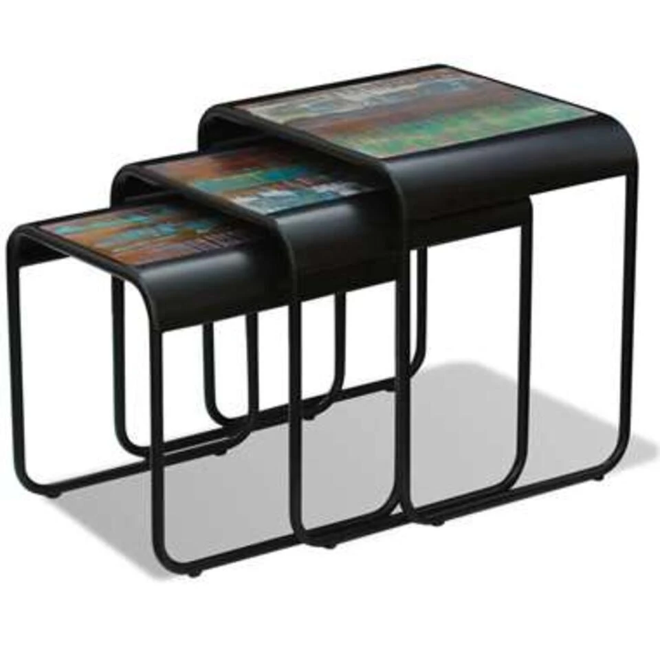 Deze set van 3 houten tafeltjes in vintage stijl is gemaakt van massief gerecycled hout en is een tijdloze toevoeging aan je huis. Deze tafels kunnen worden gebruikt als salontafels, woonkamertafels, bijzettafels, nachtkastjes, telefoontafels, enz. Dankzij het sterke stalen frame zijn de tafels stabiel en duurzaam. Omdat ze stapelbaar zijn, besparen deze tafels een hoop ruimte wanneer je ze niet gebruikt.