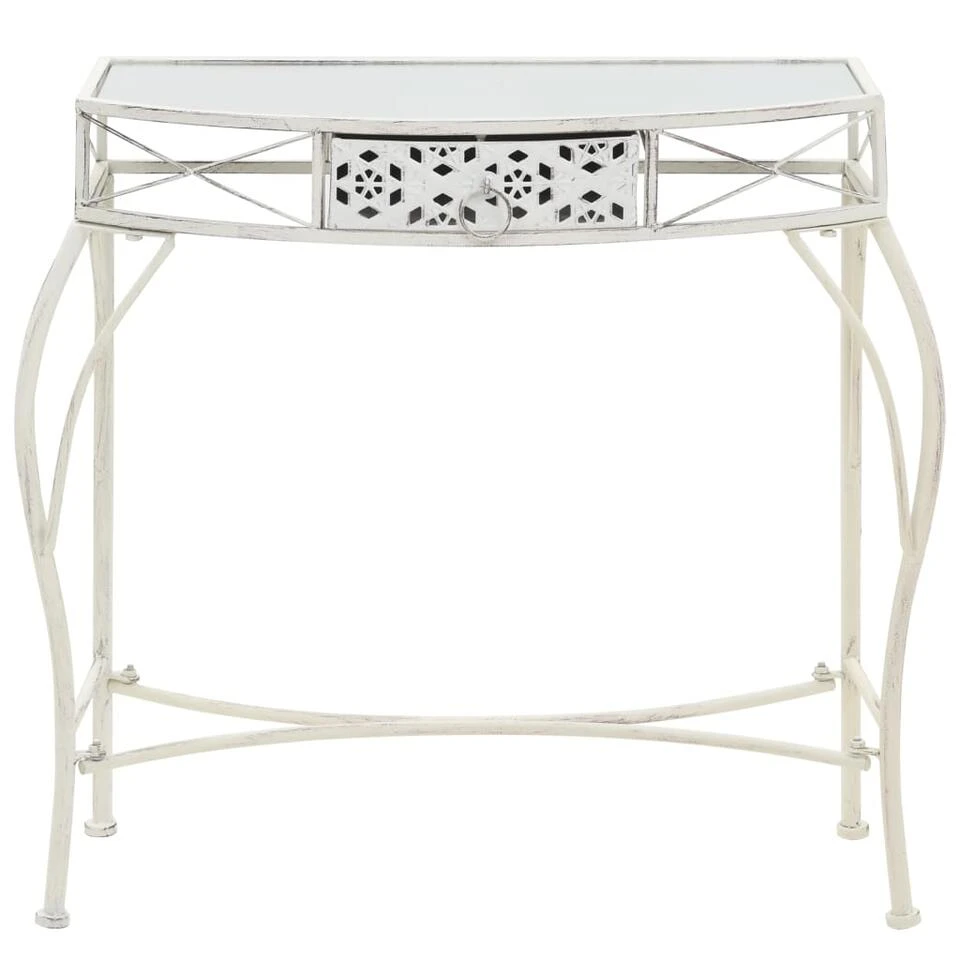 Het tafeltje heeft een metalen frame en een glazen blad, waardoor het stabiel en eenvoudig te reinigen is. De bijzettafel heeft een lade die versierd is met prachtige details die de tafel een antieke stijl geven en een vleugje elegantie in je huis creëren. Het product is eenvoudig te monteren.