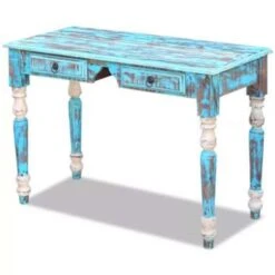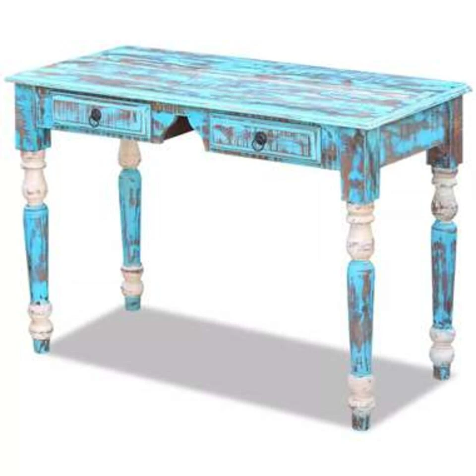 Dit houten bureau in vintage stijl, gemaakt van massief gerecycled hout, is een tijdloze aanvulling op je huis. Het blad biedt een stabiele en stevige plek voor je drankjes, fruitschaal, vaas en andere decoratieve objecten. Hij heeft 2 lades die voldoende ruimte bieden om kleinere objecten, zoals sleutels en notitieblokken, in op te bergen. Het bureau kan gebruikt worden als dressoir, consoletafel, kantoorbureau, leestafel, studeertafel, computertafel, enz.