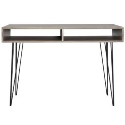Met een hoge kwaliteit MDF bovenkant en massief metalen haarspeldpoten, is dit bureau erg duurzaam, stabiel en stevig. Het ruime tafelblad biedt genoeg ruimte om uw computer, laptop, tafellamp, enz. op te plaatsen. De twee compartimenten zijn perfect om allerlei kleinere items zoals sleutels, notitieblokken, pennen en andere benodigdheden netjes georganiseerd en binnen handbereik te houden.