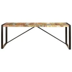 De eetkamertafel is gemaakt van massief gerecycled hout dat afkomstig is van balken, vloeren en steunbalken van oude gebouwen die zijn gesloopt. Dit hout bestaat uit verschillende houtsoorten, zoals grenen, teak, beuken, eiken, ceder, mangohout en acacia. Dit betekent dat het teruggewonnen hout de kenmerken van deze verschillende houtsoorten heeft. Gerecycled hout is al verouderd, verweerd en gedroogd en krimpt en buigt daarom niet. Deze tafel is volledig met de hand gemaakt en de mooie houtnerven maken elk meubelstuk uniek en net iets anders dan de rest. De sterke gepoedercoat ijzeren poten dragen bij aan de stevigheid van de tafel. Het product is eenvoudig te monteren.