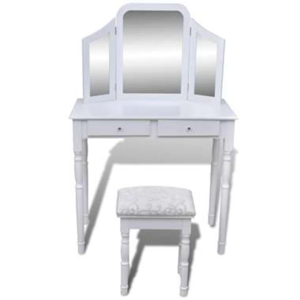 De tafel heeft een 3-in-1 tafelspiegel waarvan 2 zijspiegels inklapbaar zijn met duurzame scharnieren. Je kunt ze naar de gewenste hoek draaien. De spiegel en de tafel kunnen afzonderlijk worden gebruikt. 2 chique lades bieden extra ruimte voor je sieraden, cosmetica en andere persoonlijke spulletjes. Deze kaptafel en kruk zijn een echte blikvanger, waar ze ook staan.