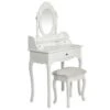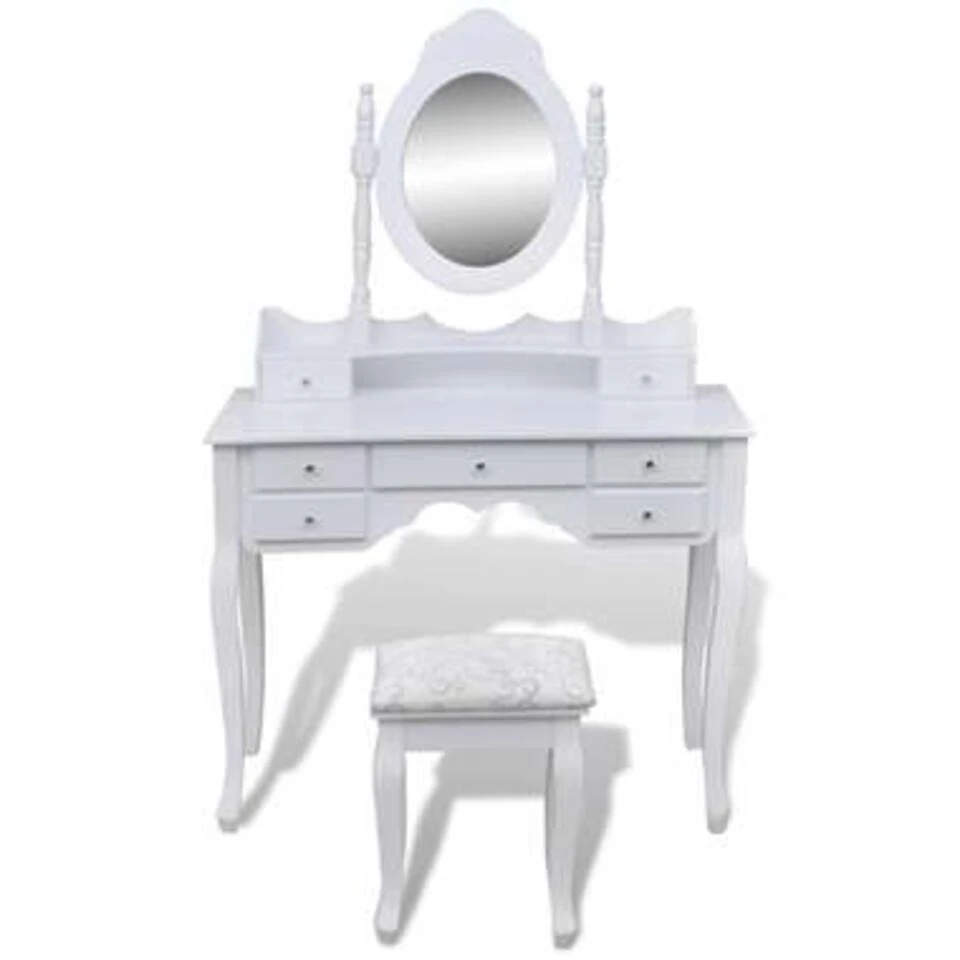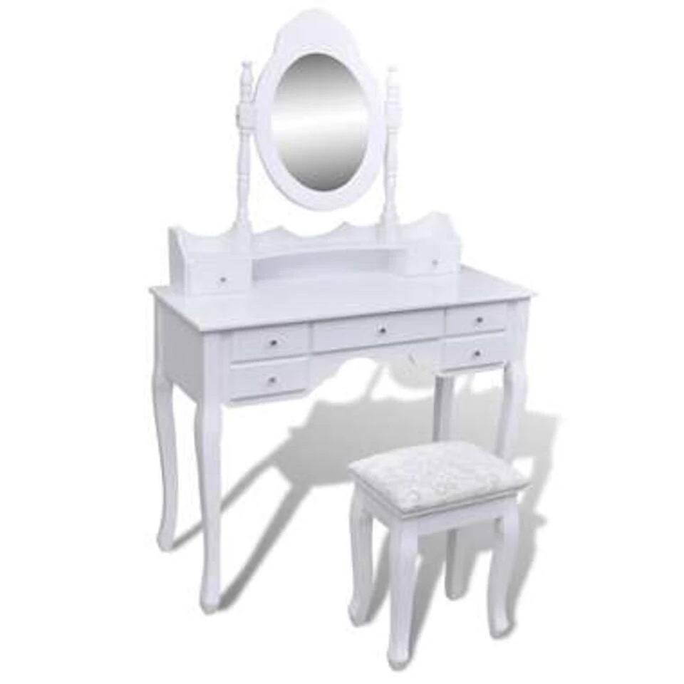 De tafelspiegel is vrijstaand, dus hij kan naar iedere gewenste hoek worden gekanteld. De spiegel en de tafel kunnen afzonderlijk van elkaar worden gebruikt. De 7 mooie lades bieden je extra opslagruimte voor je snuisterijen, make-up en persoonlijke eigendommen. Deze set van een kaptafel en krukje is een echte blikvanger, waar hij ook staat.