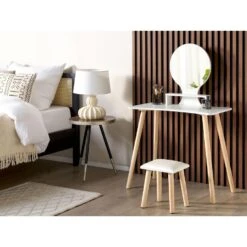 Dit prachtige dressoir is gemaakt van hoogwaardige paulowniahout en heeft een uniek silhouet en vier luxe poten. De 4 lades en 1 open vak bieden de perfecte hoeveelheid ruimte voor het opbergen van make-up en sieraden. Het tafelblad is ook een uitstekende plek om flesjes parfum of andere versieringen op te plaatsen. De meegeleverde kruk heeft een rugloze zitting die bestaat uit een kussen met een bijpassend houten onderstel. Bovendien benadrukt de ingebouwde spiegel het silhouet voor een eigentijdse flair.