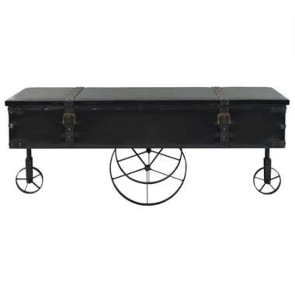 Deze duurzame en mooie tafel is gemaakt van MDF en massief vurenhout dat met gevoerd kunstleer bekleed is. De 2 grote wielen zijn ter decoratie en dragen bij aan de industriële stijl. Het tafelblad is ideaal voor het plaatsen van drankjes, vazen, potplanten, fruitmanden en andere decoratieve voorwerpen. De stalen wielen maken het gemakkelijker om de tafel te verplaatsen.