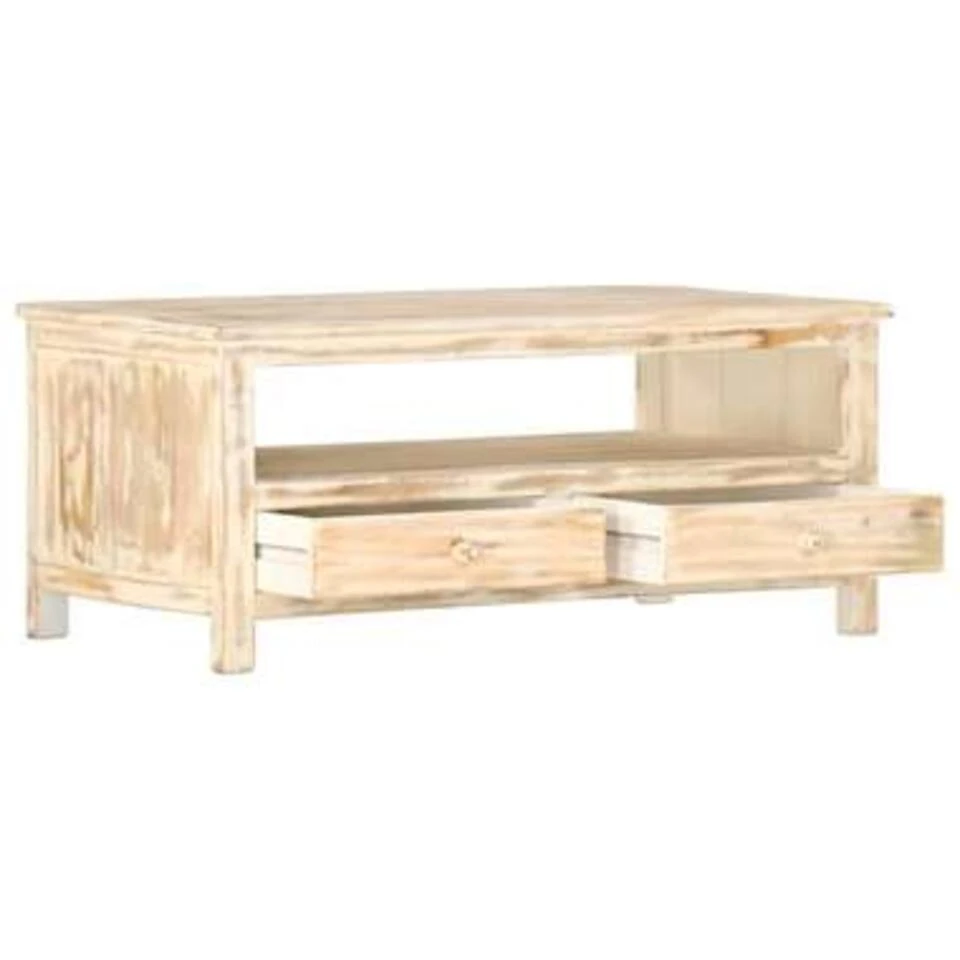 De tafel is handgemaakt van mangohout, dat massief, stabiel, duurzaam en mooi is. Het vakmanschap draagt bij aan de spectaculaire retro stijl. Elke stap van het proces wordt met de grootste zorg uitgevoerd, of het nu polijsten, schilderen of lakken is. Het vakmanschap en de mooie houtnerven maken elk meubel uniek en enigszins anders dan de rest. Het stevige tafelblad is ideaal voor het plaatsen van eten, drinken, lampen en andere decoratieve spullen. Deze salontafel heeft 2 lades en 1 open schap om je extra opbergruimte te bieden voor het binnen handbereik houden van kleine spullen, zoals sleutels, kladblokken, pennen, afstandsbedieningen en andere snuisterijen. De tafel is eenvoudig te monteren.