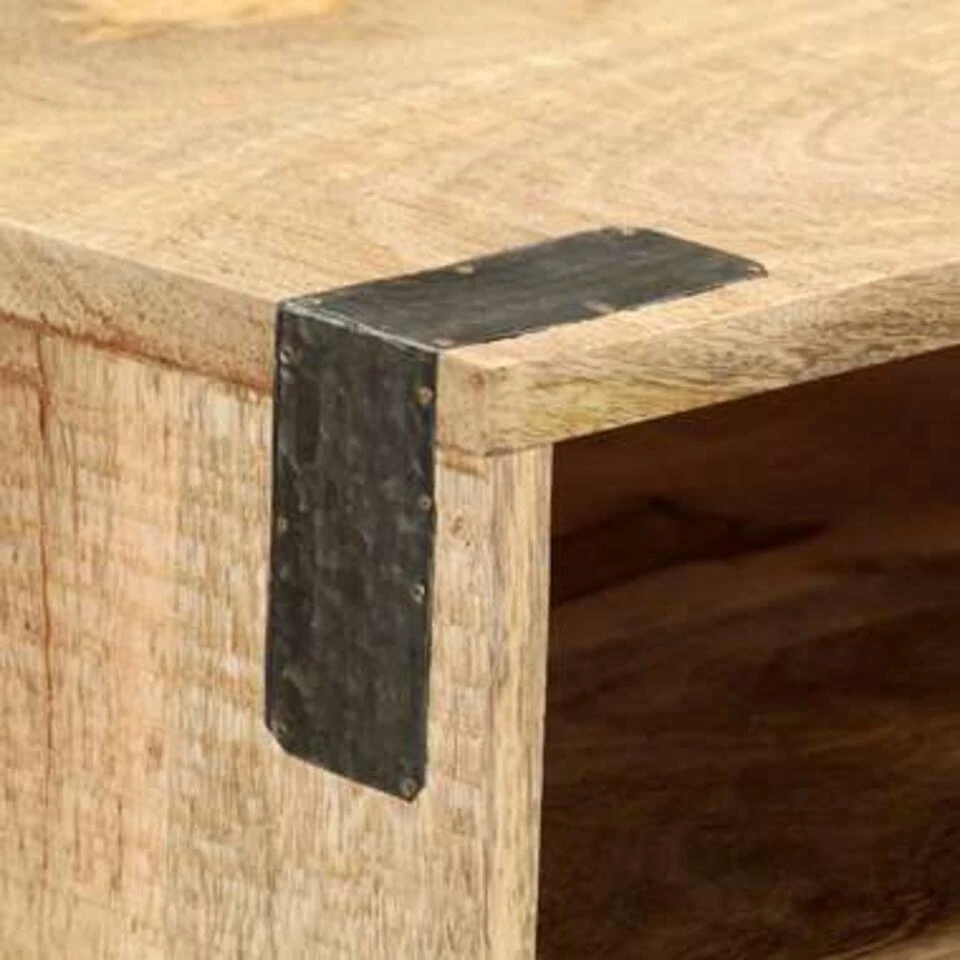 De tafel is gemaakt van massief ruw mangohout en heeft een stevig tafelblad waarop je decoratieve voorwerpen zoals fruitmanden en vazen kunt plaatsen. De stevige poten zorgen voor stabiliteit en duurzaamheid, en garanderen jarenlang gebruik. Mangohout is een dicht en robuust hardhout dat prachtige bruine of gouden strepen en contouren heeft. Elke stap van het proces wordt met de grootste zorg uitgevoerd, of het nu polijsten, verven of lakken is. De 2 deuren en 3 open vakken bieden voldoende ruimte om allerlei spulletjes geordend en binnen handbereik te houden.