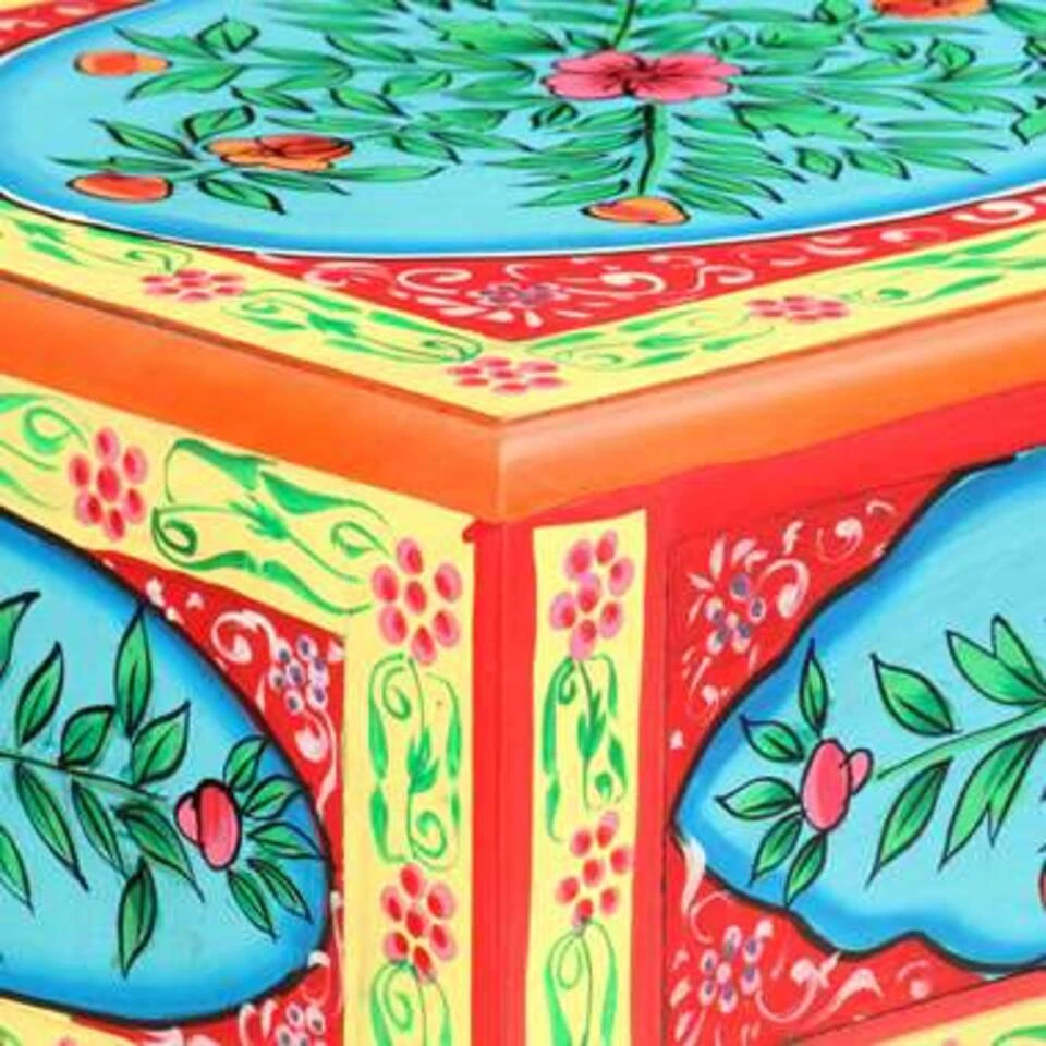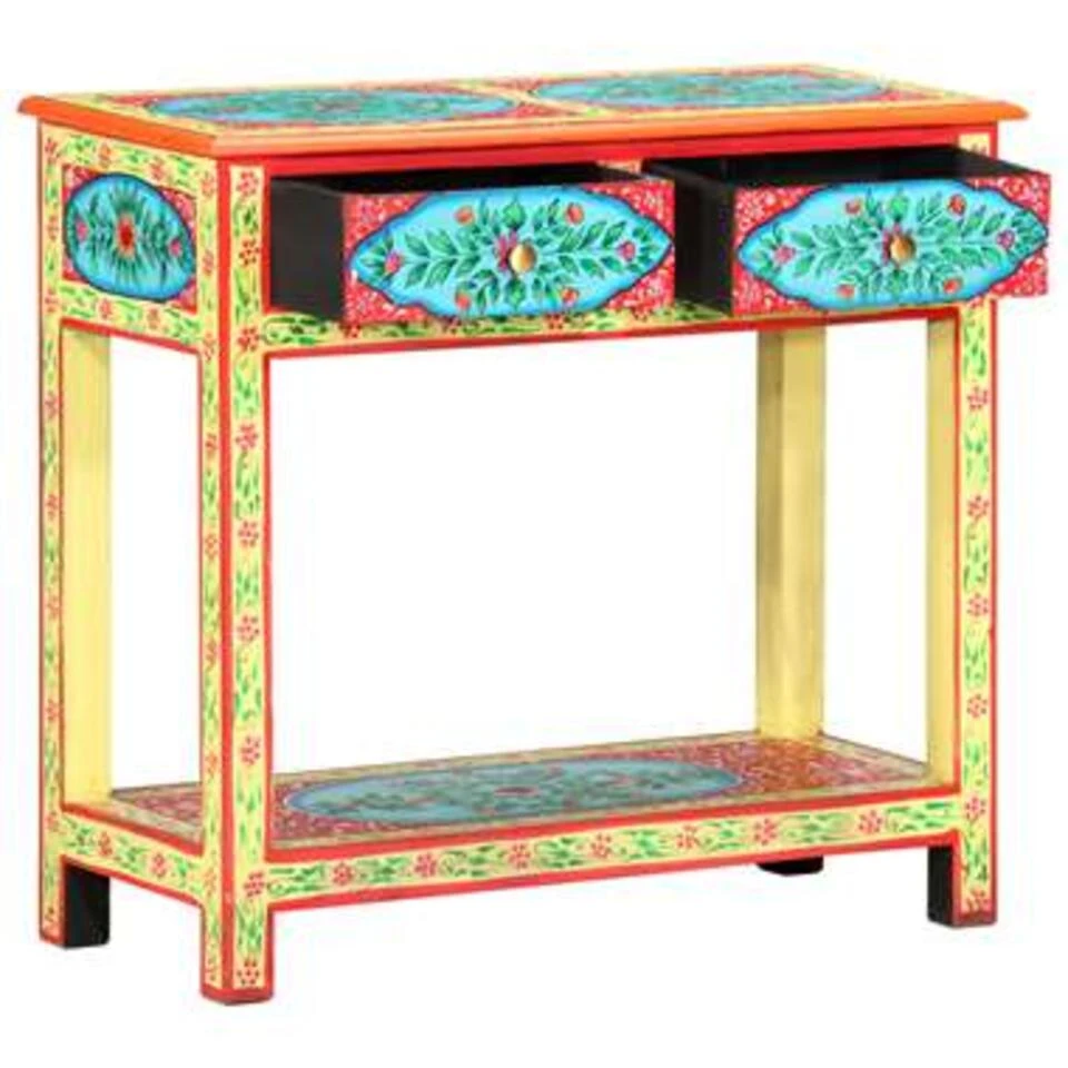 De tafel is handgemaakt van mangohout en MDF waardoor hij zowel duurzaam als mooi is. Het vakmanschap draagt bij aan de spectaculaire retro-stijl. De tafel heeft mooie, handgeschilderde, decoratieve details die een vleugje elegantie uitstralen en de verfijnde uitstraling benadrukken. De opvallende knoppen maken het makkelijker om de lades te openen en dragen tevens bij aan de stijl van de tafel.