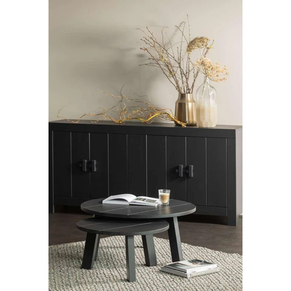 Woood bijzettafel Benson is een ronde zwarte tafel gemaakt van grenenhout. Deze tafel heeft een stoere uitstraling en een industriële look. Deze tafel heeft een afmeting van 30×60 cm (hxØ). Wil jij extra plek voor een hapje of drankje creëren of wil je jouw interieur nét wat extra sfeer meegeven? Dan is dit bijzettafeltje perfect voor jou.Â