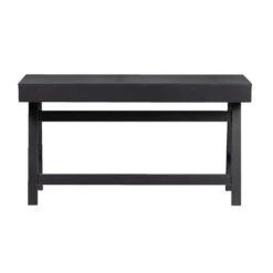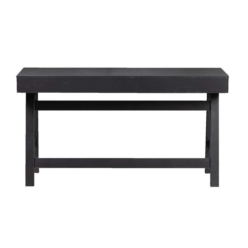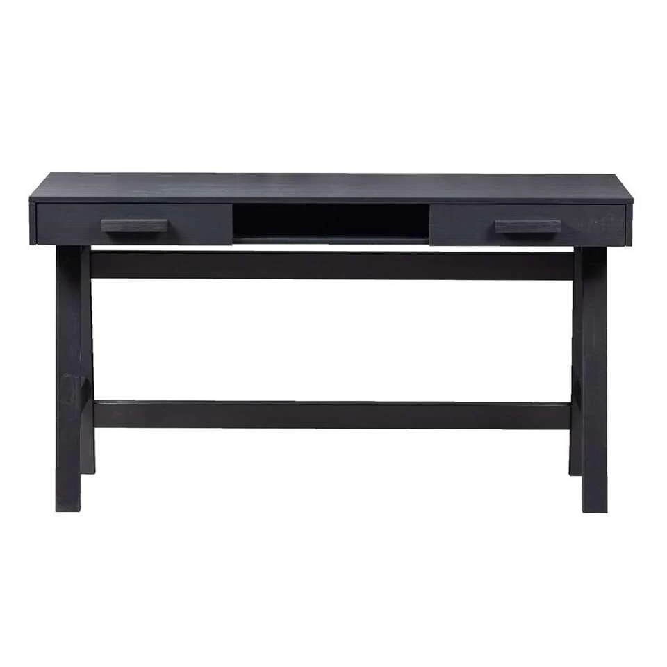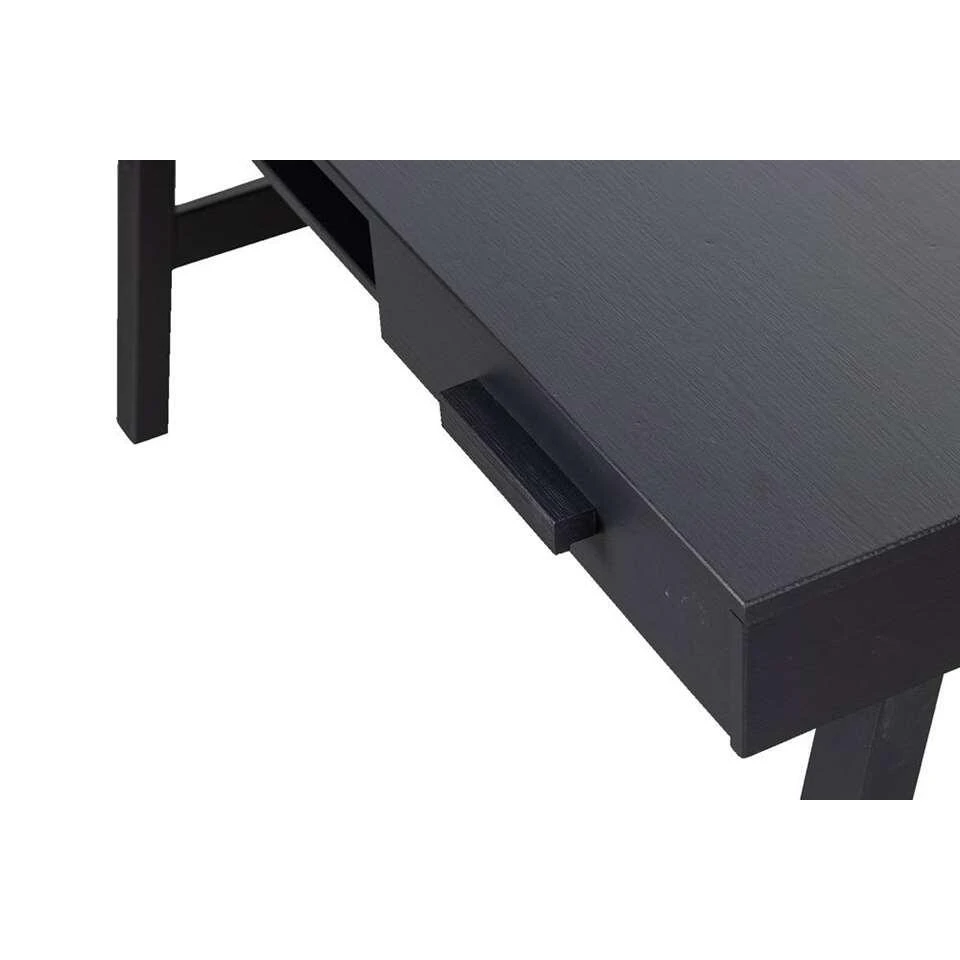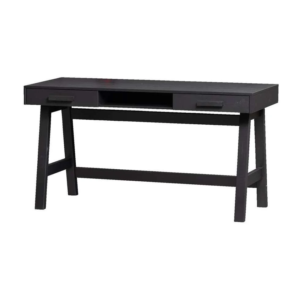 Woood bureau Benson is gemaakt van mat zwart gelakt grenenhout. Dit bureau heeft een stoere uitstraling en een industriƫle look. Het bureau heeft een afmeting van 75x140x62 cm. Met een open vak en 2 lades biedt het bureau voldoende ruimte om al je accessoires op te bergen. Door zijn stoere uitstraling en sluit hij helemaal aan bij de laatste trends!
