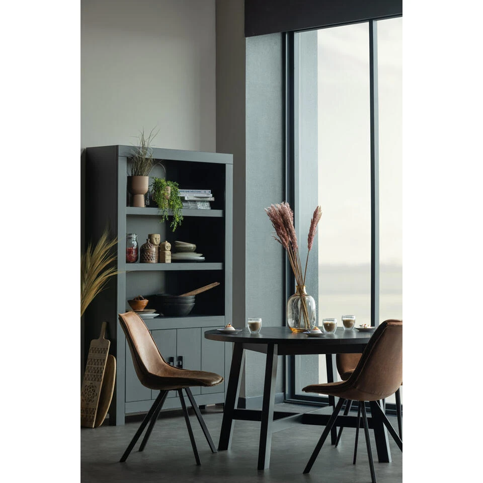 Woood eetkamertafel Benson is een ronde zwarte tafel gemaakt van grenenhout. Deze tafel heeft een stoere uitstraling en een industriële look. Deze tafel heeft een afmeting van 74×120 cm (hxØ). Kies er stoelen bij en stel zo je eigen eethoek samen.