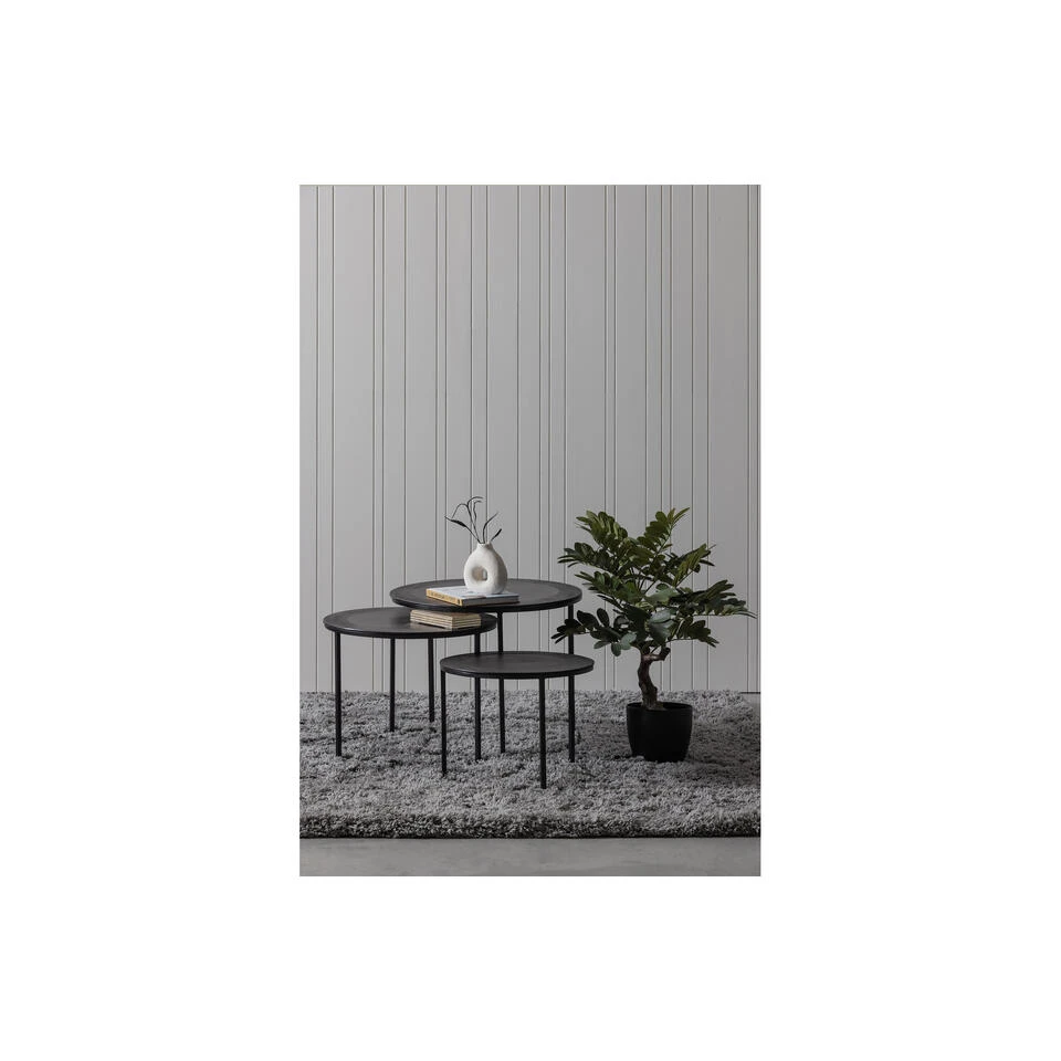 De Janna bijzettafels bestaat uit een set van drie ronde tafeltjes. Deze bijzettafelset komt uit de collectie van het Nederlandse merk WOOOD en zijn vervaardigd uit sterk metaal. Het slank metalen frame heeft drie maal een andere hoogte en zijn zo gemaakt dat ze eenvoudig onder elkaar geschoven kunnen worden. De ronde tafelbladen hebben een donkerbruine afwerking en brengen hierdoor een warme sfeer in huis.