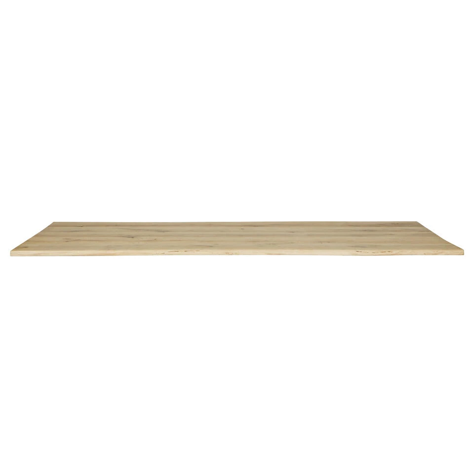 Dit rechthoekige boomstam tafelblad bestaat uit doorlopende lamellen onbehandeld eikenhout met langs de randen van het blad de natuurlijke tekening van een boomstam. Het tafelblad heeft een lengte van 180 cm en een breedte van 90 cm. Het blad is 30 mm dik.