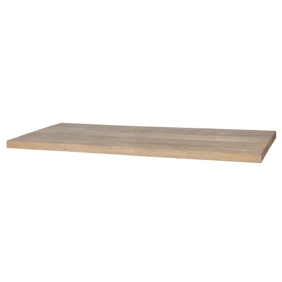 Dit rechthoekige tafelblad is van mangohout en is afgewerkt met een lime wash finish waardoor het mangohout een soort white wash laagje krijgt. Het tafelblad heeft een lengte van 180 cm en een breedte van 90 cm. Het blad is 55 mm dik en is voorzien van een opdikrand aan alle vier de zijden.